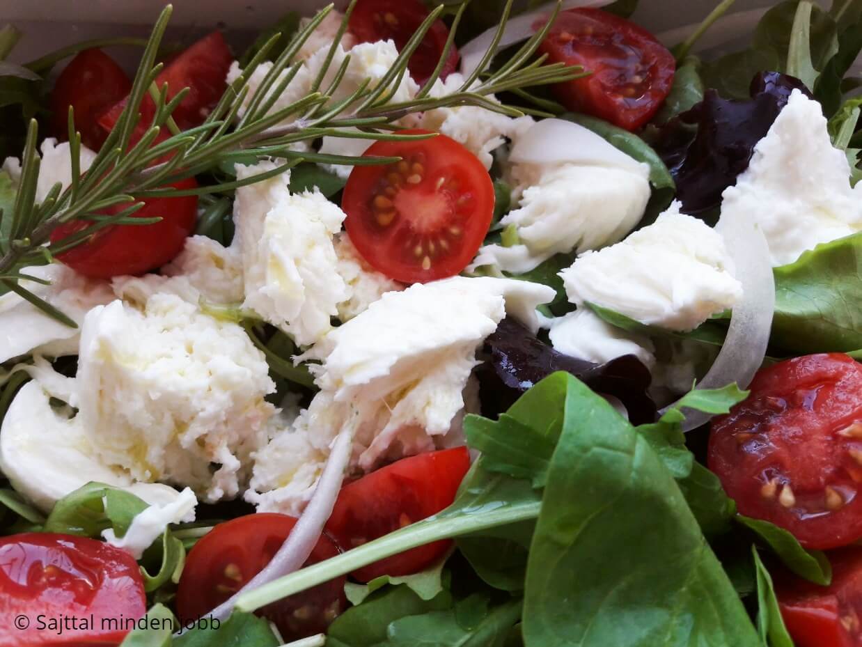 Ez a saláta a nyaralások hangulatát hozza magával. A friss mozzarella, a rozmaring, a spenót- és rukkola levelek, a gömbölyű, hófehér főzőhagyma, a koktélparadicsom…. mintha egy hamisítatlan olaszországi vacsora mellé repítene el bennünket.